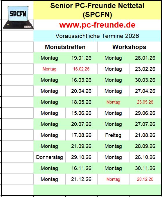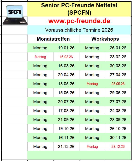 Zusätzlich am letzten Montag eines Monats für einen Workshop, zu dem die Teilnehmer ihre Laptops mitbringen, um individuelle Probleme mit fachkundigen PC-Freunden zu lösen.